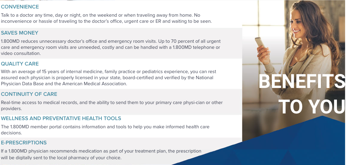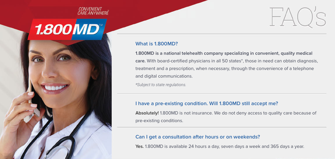 CallADoc is a service we offer by working with national telehealth companies specializing in convenient, quality medical care. With board-certified physicians in all 50 states*, those in need can obtain diagnosis, treatment and a prescription, when necessary, through the convenience of a telephone and digital communications. *Subject to state regulations.